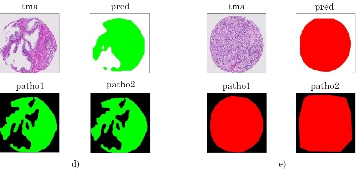 Cabe resaltar que en varias muestras la segmentación se realizó de manera precisa en contraste con las máscaras de referencia (ground-truth) que contienen una única anotación de grado de Gleason, principalmente en muestras que presentan anotaciones de grados bajos (benigno y Gleason 3), como se puede observar en la Figura 8. Esto puede deberse a que el modelo logra una buena diferenciación en los patrones glandulares para estos estadios a causa del tamaño y la separación de las glándulas. En los casos d) y e), la segmentación se realizó con una gran aproximación en contraste con las anotaciones de ambos patólogos, y la estratificación fue realizada de forma con éxito para los grados Benigno y Gleason 5, respectivamente.