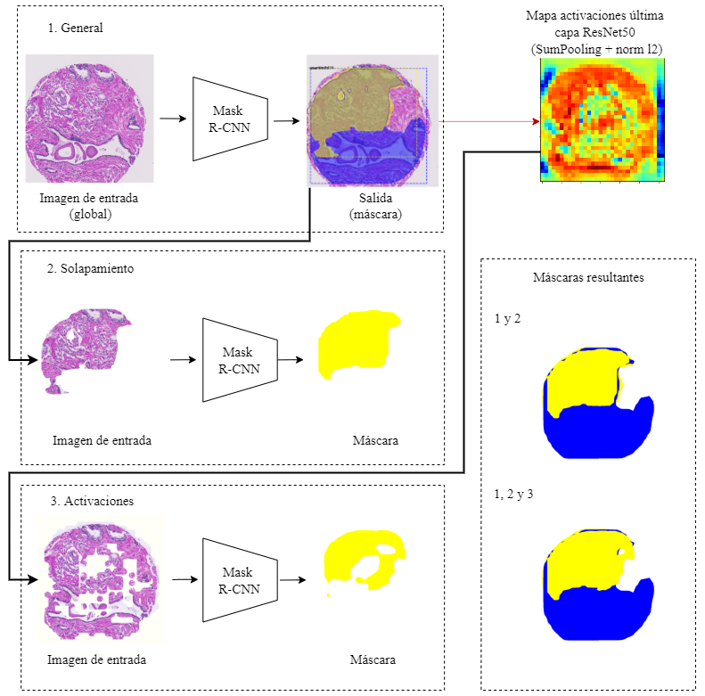 Teniendo en cuenta la complejidad del problema de caracterización de grados de severidad de cáncer, aquí se implementó una estrategia progresiva que entrena diferentes versiones de Mask R-CNN para obtener una segmentación final. En el primer nivel de representación, se entrenó una red regional utilizando anotaciones delineadas por un experto patólogo en imágenes histológicas. En el segundo nivel de representación, fue entrenada una red con anotaciones que reportan una probabilidad alta, dada por el primer nivel de representación, para diversos grados de Gleason. Una última estimación de los grados de Gleason fue recuperada desde las activaciones convolucionales de una representación profunda, que indican patrones de atención dados por la Mask R-CNN para la localización de regiones de interés en placas histológicas, extrayendo nuevos indicadores y definiendo nuevas regiones de forma local. El consenso de las tres segmentaciones da origen a la segmentación propuesta para soportar la tarea de análisis de placas histológicas. La metodología propuesta se detalla en la Figura 1.