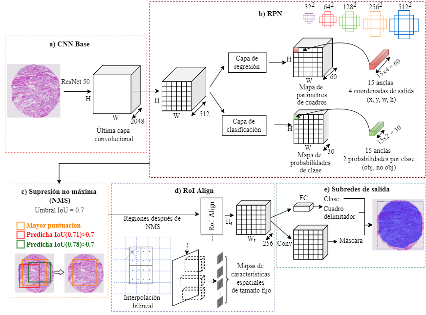 RPN (region proposal network). Es una representación de alto nivel, dada en la capa cercana a la predicción, utilizada para realizar la cuantificación de regiones de interés (RoIs), y su posterior segmentación. Específicamente, se extraen las activaciones de la última capa. Posteriormente, estas activaciones son nuevamente convolucionadas en el marco Mask R-CNN por una red donde se extraen patrones visuales. La red entrenada sobre esta capa tiene como único objetivo generar posibles regiones que contengan un objeto, llamadas regiones propuestas. Para cada posición de la ventana deslizante en las dos últimas capas convolucionales, la RPN puede predecir múltiples propuestas de región delimitadas por rectángulos de anclaje. Estos rectángulos de anclaje están centrados en cada posición de la ventana deslizante de las capas anteriormente mencionadas, y consisten en diversas escalas que indican tamaños de la región, y diferentes relaciones de aspecto que indican proporciones entre la anchura y la altura de una región. Una ilustración de los rectángulos de anclaje está disponible en la Figura 2-b. Cada región propuesta por RPN devuelve una puntuación relativa a la presencia del objeto en esa región concreta y las coordenadas que representan la región propuesta.