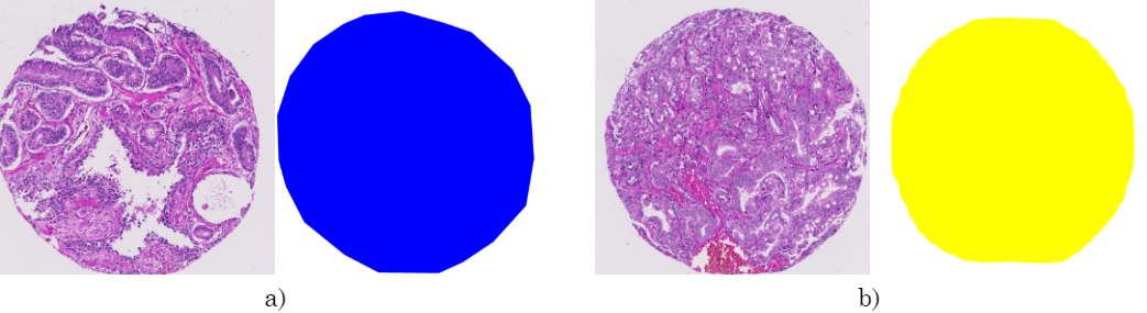 La estrategia de segmentación propuesta se entrenó y validó en un conjunto de datos publicados en el repositorio de Harvard Dataverse [20]. Este conjunto de datos contiene un total de 886 imágenes de muestras de tejido prostático, teñidas con H y E a una resolución de 40x, con un tamaño de 3100 x 3100 píxeles. Cada una de las imágenes fue digitalizada con un escáner de portaobjetos digital Hamamatsu C9600 NanoZoomer 2.0-HT [21]. Cada una de las imágenes tiene su respectiva máscara de anotación según la escala de Gleason, y están agrupadas en cinco microarreglos de tejidos (TMAs, por sus siglas en inglés). La asignación de las etiquetas de las regiones fue realizada por un uropatólogo (en este trabajo se denominará patólogo 1) en todo el conjunto de datos y por un uropatólogo adicional (en este trabajo se denominará patólogo 2) únicamente en el subconjunto de prueba. Esta disposición de las anotaciones viene dispuesta previamente en el conjunto de datos públicos. De hecho, se consideran los dos patólogos con un mismo nivel de formación. Cada etiqueta en el conjunto de datos tiene un color distintivo para identificar cada clase en la escala de Gleason de la siguiente manera: verde para benigno, azul para Gleason 3, amarillo para Gleason 4 y rojo para regiones con Gleason 5 (ver Figura 6). En cuanto al diseño experimental, los autores del repositorio proponen una partición de los datos, la cual es seguida fielmente en este trabajo.