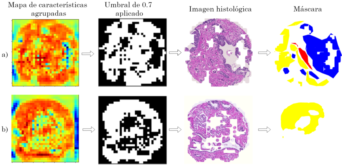 Específicamente en este trabajo, se llevó a cabo un tercer nivel de representación Mask R-CNN, en donde se tuvieron en cuenta las activaciones de la última capa de la red convolucional base (mostrada en la Figura 2-a). Esta última capa proporciona información sobre los patrones en los que se enfoca el método Mask R-CNN para localizar las regiones y predecirlas, y donde se centra la RPN para proponer regiones de interés. Esta capa tiene un total de 2048 activaciones de tamaño 32 x 32. Las activaciones de la última capa de la ResNet-50 del primer modelo se agruparon mediante SumPooling, y las características sumadas se normalizaron en l2 [18]-[19]. De este modo, se obtuvo el mapa de características agrupadas (MCA). A continuación, en el MCA, se tomaron los píxeles superiores a un umbral de 0.7, y se tomaron las regiones proporcionales a ese umbral para las imágenes histológicas y sus máscaras para el entrenamiento (ver Figura 5). Con estas regiones se entrena un nuevo nivel Mask R-CNN permitiendo una descripción más granular de las regiones. Para la prueba, sólo se tomaron las regiones proporcionales al umbral de activaciones en las placas histológicas, prediciendo así una nueva máscara, determinada a partir de las regiones de las activaciones convolucionales de la primera red.