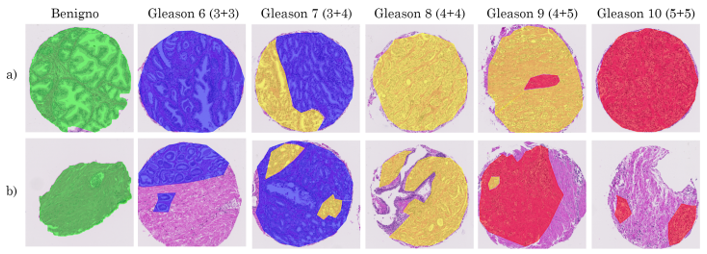El cáncer de próstata es el cuarto más frecuente en el mundo, con más de un millón doscientos mil nuevos casos y más de trescientas mil muertes cada año [1]. Existen diversas herramientas diagnósticas como la resonancia magnética, ecografía transrectal, pero con reportadas limitaciones de especificidad en la tarea de detección, caracterización y prognosis de la enfermedad [2]. Es por ello por lo que hoy en día las biopsias constituyen el principal método para cuantificar la agresividad de la enfermedad, mediante un análisis histológico de imágenes microscópicas. Estas imágenes son obtenidas mediante la tinción de muestras con hematoxilina y eosina (H y E), que permiten destacar y caracterizar la distribución arquitectural de las células y la geometría atípica de estructuras glandulares [3].