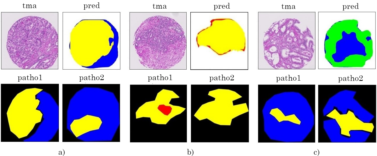 La alta variabilidad descrita en los protocolos de anotación se puede ilustrar en la Figura 7-a. Las máscaras de los patólogos 1 y 2 presentan diferencias regionales en su anotación, debido a la persistente subjetividad. Sin embargo, la máscara final predicha presenta una recuperación en las anotaciones de puntajes de Gleason 3 y 4 y una óptima segmentación comparada con la máscara del patólogo 1. En distintos casos se presentan mejoras en la segmentación debido al tercer nivel de representación, como por ejemplo la región en amarillo (Gleason 4). Del mismo modo, en la Figura 7-b, la máscara predicha presenta una recuperación en la anotación de Gleason 4 (amarillo), ya que, como se puede observar, el primer nivel de representación predijo toda la muestra como Gleason 5 (color rojo). Este ejemplo permite evidenciar la complejidad de la tarea de anotación, pero también la utilidad de comprender diferentes niveles de representación. En la figura 7-c se reportan algunas limitaciones del método propuesto debido a la similitud estructural que existe entre grados contiguos (por ejemplo, Benigno y Gleason 3), y a la complejidad de estratificar las imágenes histológicas y diferenciar sus patrones.
