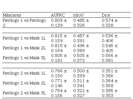 En la Tabla 1 se resumen los resultados obtenidos para el conjunto total de evaluación, utilizando el enfoque propuesto con diferentes niveles de representación y comparándose con respecto a cada uno de los patólogos de forma independiente. Para la validación se tuvo en cuenta las métricas de AUPRC, mIoU y Dice, que reflejan la capacidad del método propuesto en tarea regional de segmentación, con respecto a la referencia de los patólogos expertos.