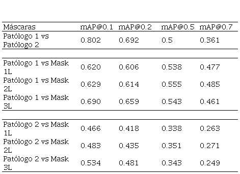 A pesar de los desafíos inherentes para obtener una máscara ideal que determine el área de un estadio particular de Gleason, resulta relevante en este trabajo determinar la eficacia en localizar apropiadamente estos estadios. Es por ello que en una segunda evaluación se procedió a validar la propuesta con la métrica mAP, pero sometida a diferentes umbrales de la intersección de las regiones. En este caso, la métrica valida si por lo menos existe una intersección del 10 % (mAP@0.1) entre la predicción y la referencia. De este modo, puede estimar y ponderar mejor la localización que la determinación de áreas del grado de Gleason. La Tabla 2 presenta los resultados obtenidos con diferentes umbrales en la métrica mAP, siendo destacable el resultado del enfoque propuesto, utilizando la configuración completa (Mask 3L) en mAP@0.1 y mAP@0.2, respectivamente.