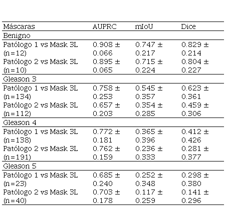 Asimismo, se hizo un análisis por grado de forma independiente, calculando las métricas para cada grado de Gleason. En este caso, para cada estadio se tomó su respectiva anotación presente en las máscaras de referencia y se comparó con respecto a la anotación de las máscaras finales de la metodología propuesta Mask 3L (ver Tabla 3). Con esta comparación se busca indagar sobre las capacidades particulares del enfoque propuesto, con respecto a los patrones visuales que agrupan cada grado de Gleason. Se observó que el patrón aprendido de mayor asociación es el grado benigno, que resulta el más frecuente y de patrones texturales relativamente constantes en todo el conjunto de datos. De hecho, para este grado existe un puntaje significativo tanto en AUPRC como en métricas relacionadas con la segmentación regional, alcanzado puntajes de Dice superiores al 80 %.