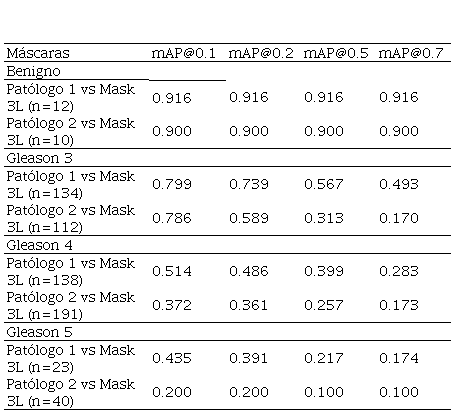 Se realizó una evaluación discriminada por grados de Gleason y teniendo en cuenta diferentes niveles de umbral de intersección de regiones, en la cuantificación del mAP. En la Tabla 4 se reportan los resultados para los diferentes niveles de Gleason. Como es de esperarse, el nivel benigno, con patrones planos y poca variabilidad tiene una alta correspondencia tanto en la localización (mAP@0.1), como en puntajes asociados con la segmentación (mAP@0.7).