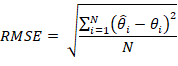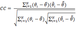 Donde θ ̂i es el ángulo de amplitud estimado, θi es el ángulo de amplitud verdadero de la muestra i, y N es la longitud de los datos de la amplitud del ángulo. Para este estudio, después de realizar el entrenamiento de los modelos de regresión con el 70 %, se hace la predicción de los modelos con el otro 30 %, donde el RMSE y el CC es calculado para la evaluación de la generalización de los métodos. El procedimiento, se repite a través de la validación cruzada k-fold.
