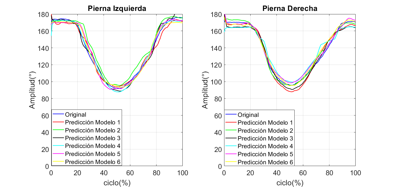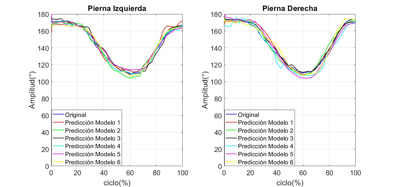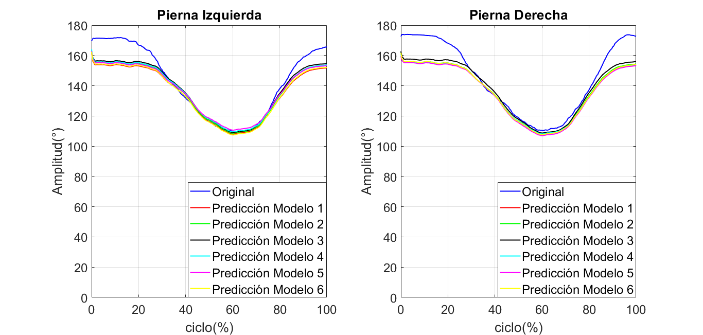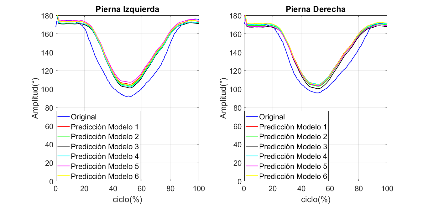 Las Figuras 3 y 4 muestran los resultados de la estimación de los ángulos de la pierna izquierda y derecha de dos sujetos (mujer y hombre) que realizaron el squat . Estos ángulos fueron estimados por la RNA. En estas gráficas, la línea azul representa los ángulos originales, la línea roja indica el ángulo estimado por el modelo 1 de la RNA, y así sucesivamente como se indica en las leyendas de las figuras.