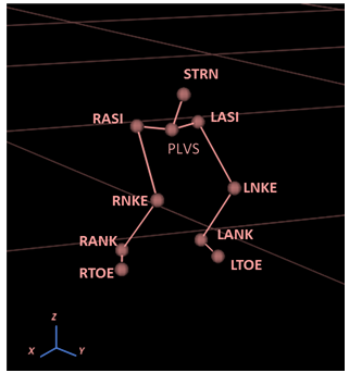 Para el registro se utilizaron diez marcadores pasivos (ver Figura 1), que fueron ubicados en posiciones articulares y etiquetados siguiendo las recomendaciones de la International Society of Biomechanics (ISB) [35]: en la cadera, RASI y LASI; en las rodillas, RKNE y LKNE; en los tobillos, RANK y LANK; en los pies, RTOE y LTOE; en la pelvis, PLVS; y, por último, cerca al centro de gravedad, STRN. Además, se utiliza la denominación R para derecha y L para izquierda.
