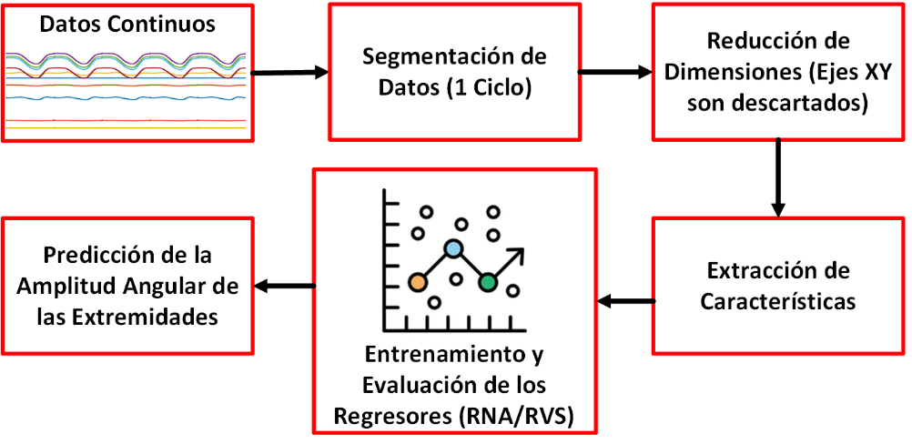 Finalmente se reporta el uso de máquinas de soporte vectorial (SVM), las cuales han sido utilizadas en el campo de la biomecánica en su mayoría para la clasificación de alteraciones y patologías [32], [33], pero no para la predicción de estas.