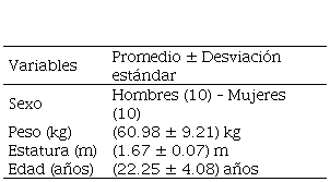En este estudio, veinte jóvenes voluntarios (diez hombres y diez mujeres), sin acondicionamiento físico y sin ninguna patología que afectara el movimiento, fueron grabados mientras realizaban el ejercicio de squat. En la Tabla 1 se puede observar el promedio de los datos antropométricos de los sujetos que participaron de las pruebas.