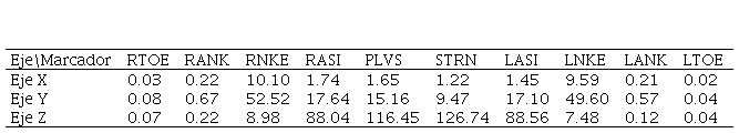 En este trabajo fueron utilizadas 3184 muestras. La varianza fue calculada para cada eje (ver Tabla 2). Se puede observar en los resultados de la varianza calculada, que el eje que contiene más movimiento de marcadores o mayor varianza matemática corresponde al eje Z.