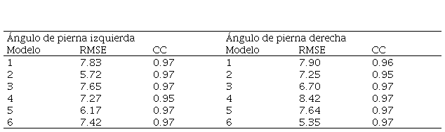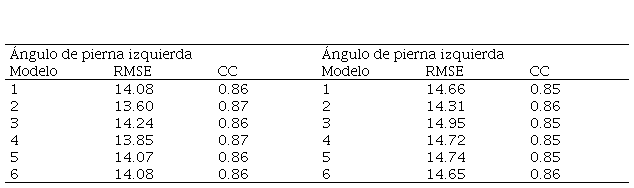 En comparación de los métodos aplicados en este estudio con la literatura, se puede ver una disminución de la incertidumbre; por ejemplo, en [5] se implementan redes neuronales basadas en Long Short-Term Memory (LSTM) para el análisis de marcha en diez pacientes menores con parálisis, donde los valores RMSE estuvieron entre 5.2° y 11.2° con CC entre 0 y 0.7. En [3] se implementa una estimación a través de sensores inerciales con un error RMSE promedio de aproximadamente 8.2 grados, mientras que en el trabajo reportado en [26], se han usado redes neuronales para estimar el ángulo de amplitud durante el squat usando las señales de electromiografía (EMG) en cuatro sujetos de pruebas, implementando métricas de evaluación con valores aproximados de RMSE en 5 grados y el valor medio de coeficientes de correlación (CC) en 0.99. Por otro lado, en el presente estudio el RMSE mínimo fue de 5.72 grados y el mayor CC fue de 0.97 para la estimación del ángulo de pierna izquierda con el modelo 2, usando la RNA como regresor.