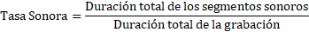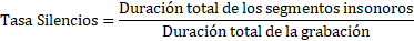 Prosodia: hace referencia a la entonación y sincronización en la producción del habla natural [43]. Los descriptores que se decidieron extraer para esta dimensión son la media, desviación estándar y el máximo de F0 y la intensidad de la señal. También se compararon segmentos sonoros e insonoros, en donde se evaluó la tasa sonora y la tasa de silencios, (8) y (9) respectivamente, así como la media y la desviación estándar de la duración de los segmentos sonoros e insonoros.