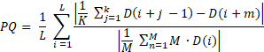 donde L=M -(K -1), D(i) corresponde a la secuencia del período de F0 o amplitud según corresponda (PPS, cuando se calcula PPQ, y PAS, cuando se calcula APQ), M es la longitud de la PPS o PAS, 𝐾 es la longitud de la media móvil (normalmente 11 para APQ y 5 para PPQ), y m=(K -1)/2.