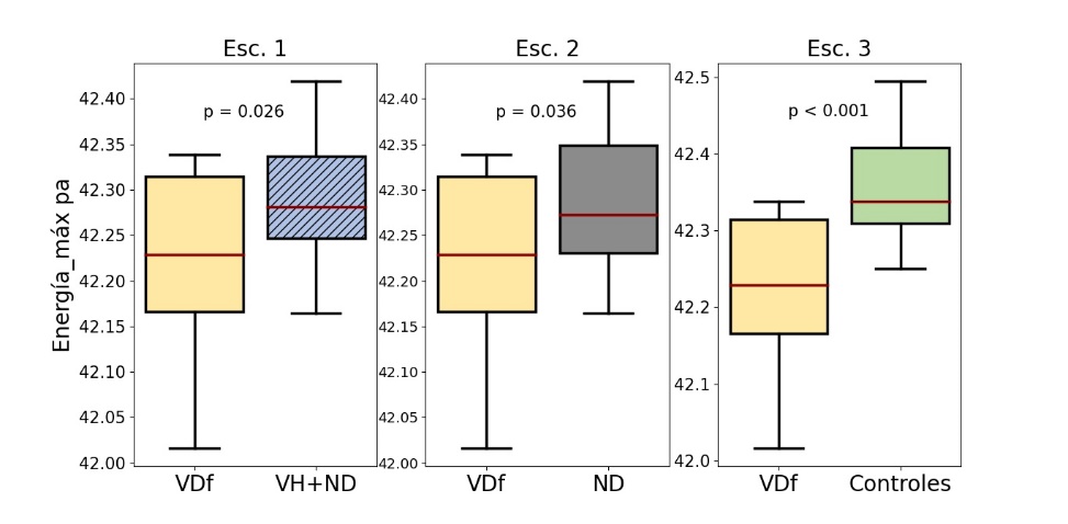La distribución de la energía media de la lectura del grupo VDf se ilustra en la Figura 8, donde se ve que la mediana de la distribución de este grupo se encuentra por encima de la mediana de los otros grupos de comparación en todos los escenarios, en especial en el escenario 3, donde la mediana del grupo VDf se encuentra por encima de la distribución del grupo de controles y tiene una fuerte DES. Esto puede estar relacionado con el hecho de que los pacientes con VDf deben de hacer un esfuerzo mayor que los demás individuos para realizar la lectura debido a los cambios de entonaciones y fonemas que esta tarea presenta.