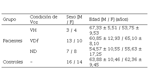 La muestra de pacientes se dividió en tres subgrupos diferenciados por condición clínica de la voz: voz húmeda (VH), voz disfónica (VDf) y voz normal o no determinada (ND). Dicha condición es etiquetada por una fonoaudióloga con experiencia certificada en pacientes con disfagia. La Tabla 1 muestra la distribución demográfica de la base de datos, en donde la edad está dada en años y presentada en media y desviación estándar.
