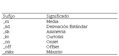 Con el fin de hacer más sencilla la lectura e interpretación de los resultados, en la Tabla 2 se observa un listado de sufijos empleados en el reporte de características y su respectivo significado.