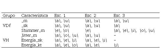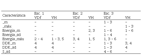 En la Tabla 3 se muestran las características con el criterio de reporte establecido, en donde cada uno de los grupos evaluados presentaron características estadísticamente diferentes entre sí, es decir, el grupo VDf reporta DES en la media de ∆F0 y el Shimmer y la asimetría de la ∆F0, mientras que el grupo VH las exhibe en la media del Jitter y en la asimetría y curtosis de la energía.
