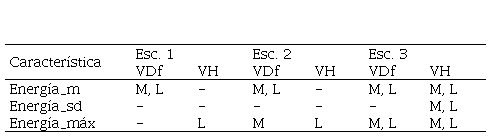 La Tabla 5 muestra las características que cumplieron con el criterio de reporte, en el que se puede apreciar que las tres características de la energía presentan DES en alguna de las tareas o escenarios evaluados. La característica con menor incidencia de las tres es la desviación estándar de la energía, pues solo se presenta en el escenario 3 del grupo VH, en ambas tareas. También se puede apreciar que se presenta DES en la energía media del grupo VDf, en ambas tareas en todos los escenarios.