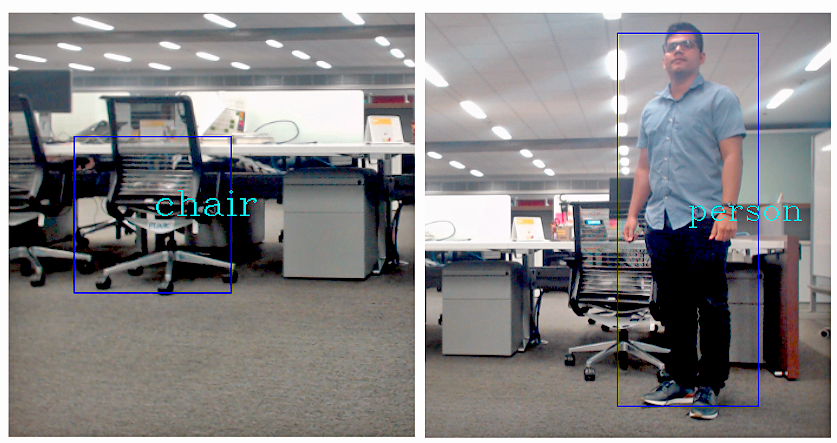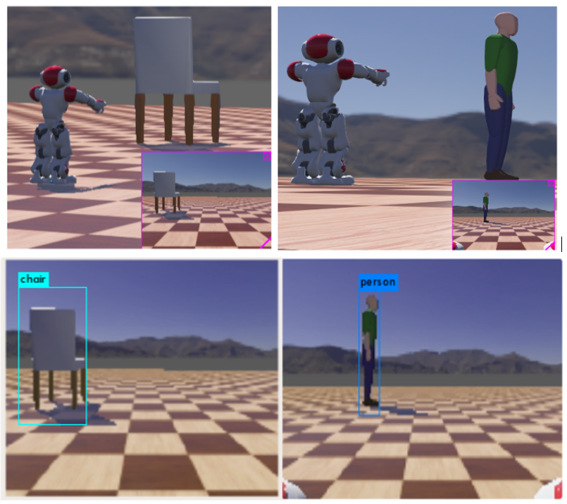 For the second framework, the image was acquired with a high-resolution webcam in real time, which was done with the help of the OpenCV libraries installed by default in the PYNQ framework. In Figure 5, the top images show the humanoid robot NAO interacting in a virtual environment created by Webots. The bottom images show the object position boxes and the prediction of identified objects in the embedded systems. Figure 6 presents the detection of the same objects created in the virtual setting (i.e., a chair and a person) but in a real controlled environment.