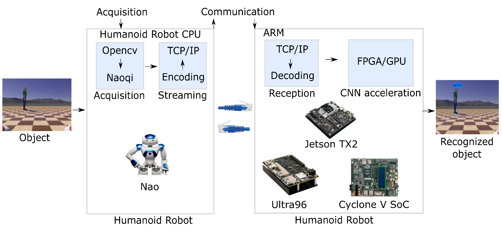 The following subsections detail the image acquisition-communication system and the implementation of the CNNs on each development board using CNN acceleration frameworks. Finally, we present the design of a backpack for NAO, which contains a heterogeneous architecture and a battery to power it. This approach allows an external computational system to provide NAO with increased accuracy while maintaining its autonomy and mobility.