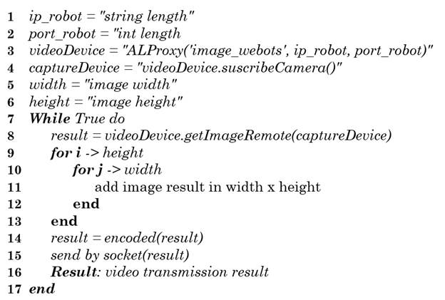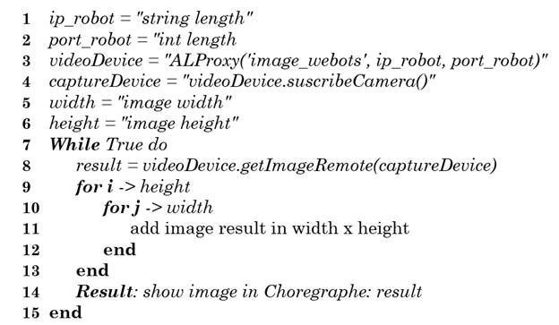 From the function ALProxy the video transmitted by Webots is obtained from Choregraphe and is sent to the video monitor using the subscribeCamera function. Finally, the obtained image is displayed on the Choregraphe video monitor using the getImageRemote method. The pseudocode of the video acquisition is shown in Algorithm 1.