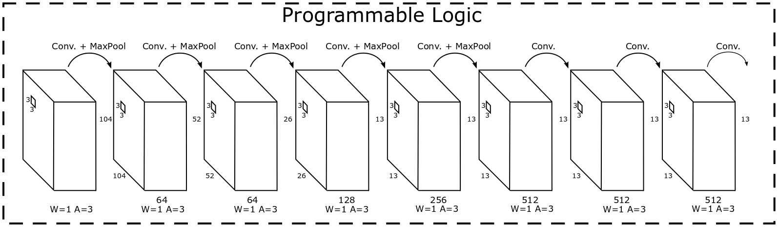 Figure 4 shows the Tinier-YOLO network architecture, which is implemented in the Ultra96 SoC. The input and output layers are executed in software (ARM) through Python, while the internal layers are executed in hardware (FPGA). The layers consist of operations such as convolutions and max pooling. The framework supports only quantized layers, meaning that weights and activations are represented from 1 to 3 bits. Tinier-YOLO is a modified version of the Tiny-YOLO object detection system. Tinier-YOLO is also trained with the PASCAL VOC database, but with 1 bit for weights and 3 bits for activations. Tinier-YOLO achieves 50.1 % mAP, while Tiny-YOLO achieves 57.1 % mAP.