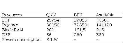 In the application explored here, i.e., classification of toys for early childhood education, the modified implementation of the Inception-V3 network achieved a 98 % classification rate and a real-time performance of 27 fps. This architecture was implemented at a clock frequency of 370 MHz using the DPU. The SGD optimizer was used with a learning-rate of 0.0001 and a momentum value of 0.9; category cross-entropy was employed as the cost function. For the training with transfer-learning, the first 172 convolutional layers of the network are frozen, and the output layer of Inception-V3 is a softmax activation with 1000 classes. In this study, this layer is removed and replaced with a 10-class softmax layer, whereby this layer is trained together with the remaining dense layers for this application, which is focused on the classification of 10 types of toys. The training result obtained in Keras was converted to the DNNDK framework using the DECENT and DNNC tools, in which the elf file containing all the CNN information (weights and architecture) was created. During the inference, this file was read by the ARM of the FPGA SoC, which was in charge of sending the tasks to the DPU to process and the returned result. The resources used in the Ultra96 for the QNN framework, and the IP DPU are shown in Table 5.