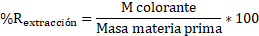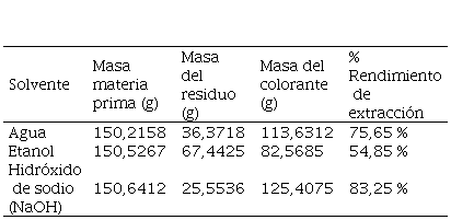En la Tabla 2 se presentan los valores evaluados de la extracción (solvente utilizado, masa de colorante, masa de materia prima y porcentaje de rendimiento de extracción).