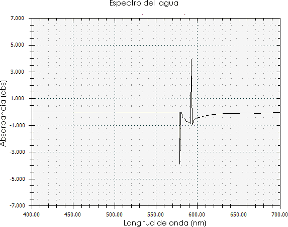 En la Figura 7, inicialmente el rayo de luz del espectrofotómetro incidió perpendicularmente sobre la extracción con agua del colorante del totumo, este absorbió la luz arrojando una longitud de onda de 580 nm y 590 nm debido a un compuesto químico que absorbe la luz llamado cromóforo. La cantidad de luz absorbida dependerá de la distancia que recorre la luz a través de la solución del cromóforo y de la concentración de este; además, la longitud de onda en ese rango absorbe el color amarillo y refleja el azul. Luego se observa una absorbancia negativa de la radiación incidente, es decir, dispersará el 100 % de una radiación incidente de baja potencia, indicando que está por debajo del nivel del espectrofotómetro que trabajó entre 400 nm y 700 nm. Este fenómeno ocurre debido al alto contenido de sedimentos presentes en la muestra [37].