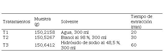 Se procedió a llevar la pulpa previamente macerada a un vaso de precipitado de 500 ml y se adicionaron 300 ml de solvente (agua, etanol al 98 % e hidróxido de sodio al 48,5 % a 0,5 N). Luego se llevaron los vasos de precipitado a una plancha de calentamiento a una temperatura de 75 °C con agitación constante a una potencia de 450 rpm durante 20 minutos para el agua, 30 minutos para el etanol y 1 hora para el hidróxido de sodio (Tabla 1).