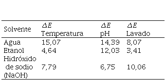 A partir de la Figura 4 se puede concluir que la muestra más susceptible a variación de diferencia total de color final en la prueba de lavado es la muestra extraída con agua, que presenta un valor de ΔE = 8,47, seguida de la del hidróxido de sodio, ΔE = 1,6, y por último la de etanol, con ΔE = 3,41. Esta se considera la mejor, presentando un valor de ΔE más estable, por tanto mantiene la fijación de color percibida por el ojo humano en un mayor período de tiempo sin modificaciones notables [32].