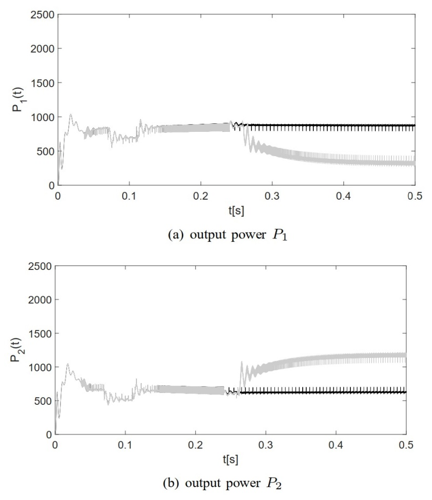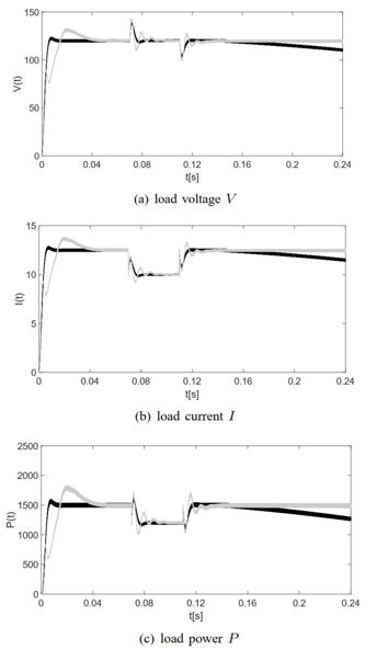 In addition, a variation in the supply voltage E1 (from its nominal value of 60 V DC to 55 V DC) was included during the interval t ∈ [0.14, 0.24] s, emulating the decaying lobe of solar radiation after the noon. The corresponding results without control are presented in Figure 3 (dark trace), showing changes in load power (1500 W) as an effect of system disturbances.