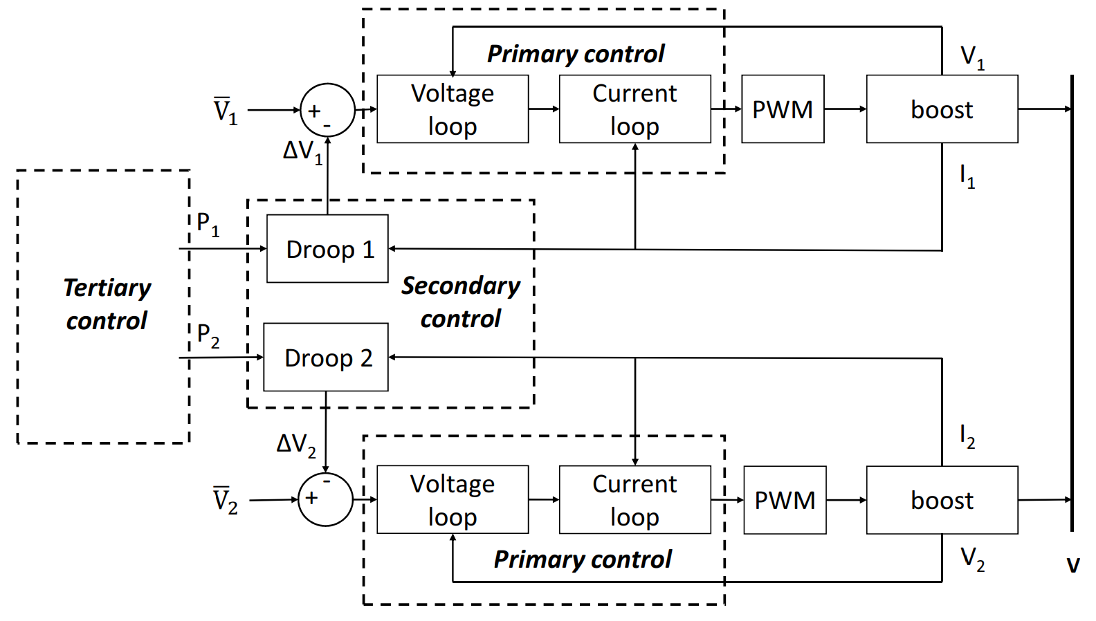 The droop control technique is a well-known method to achieve power scheduling on electrical grids being adaptable to a hierarchical structure with several levels of regulation loops. Related works include the classical paper of Guerrero et al. [23] defining the hierarchic control of microgrids. In [24] and [25] developments are presented on the application of such control topology to DC microgrids. Dispatch and control for DC microgrids are explored further in papers like [26] with a multiagent supervisory control approach; [27] focusing on the dispatch of storage units and [28] including real price constraints on DC microgrids subjected to droop control.