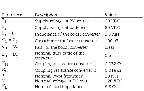 Figure 1 depicts the isolated microgrid selected as a case study. The system includes a series of 5 photovoltaic (PV) panels of 12 VDC / 310 W (for a total power of 1550 W / 60 VDC) in parallel with a bank of 5 batteries of 12 VDC / 250 Ah arranged in series (for a total power of 15000 Wh / 60 VDC), feeding a resistive load demanding 1500 W / 120 VDC. The connection interface between each generator (PV array and batteries) and the DC bus was performed via DC/DC boost power converters. The situation illustrated is inspired by charging units for electric vehicles in Bucaramanga – Colombia (https://www.essa.com.co).