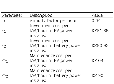 being α the annuity factor, I the investment cost per unit power P installed, and M the maintenance cost per unit power P installed. In particular, employing the information provided by IRENA (https://www.irena.org) on statistics for the year 2021, the cost functions for the PV array and the battery bank were constructed by coefficients listed in Table 2, estimating a total generation cost of the microgrid as in (4):