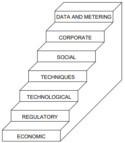 The impact of each obstacle in an industry depends on different factors, such as the sector, the processes, the automation level, the method's standardization, and the organizational structure. For this reason, the steps' height will be equivalent to the magnitude of the barrier and the difficulty of overcoming it, and the steps' extension represents the time to overcome it. According to the above, the obstacles magnitudes are different for all industries. The only barrier affecting all sectors is regulatory since regulations are established for each productive sector and not individually for a particular enterprise. This classification analyzes the industry from a technical, technological, social, cultural, and economic point of view to discover the factors that can influence energy inefficiencies.