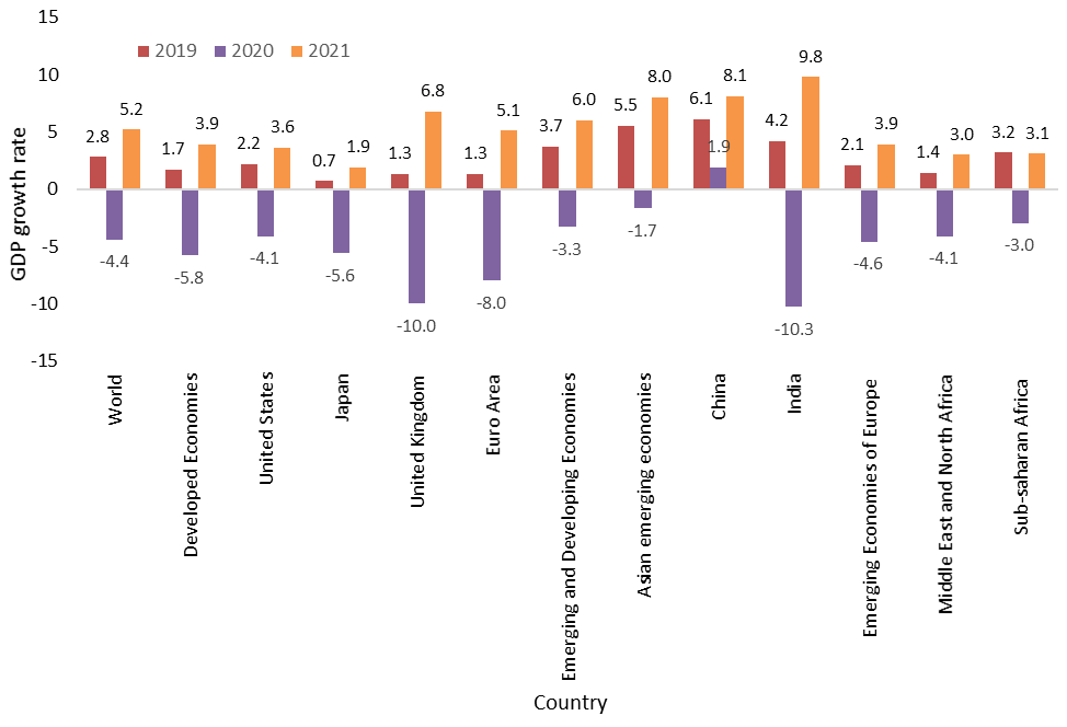 For 2021, world output growth of 5.2 % is forecast, driven by emerging economies, whose rebound would be above that of developed economies [97]. Figure 8 shows the GDP growth rate during 2019 and the projections for 2020 and 2021.