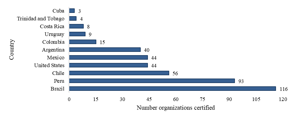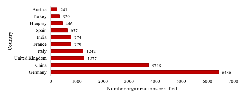 Nevertheless, another is the panorama at the international level, where Germany heads the list of certified organizations with 6 436 certifications, China with 3 748 certifications, and the United Kingdom and Italy with 1 277 and 1 242, respectively, as evidenced in Figure 3. The number of certified organizations in a country reflects the incentives or compensations offered by the government for the inclusion of policies that allow the development of cleaner and more efficient processes [31].