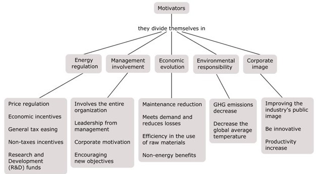 Consequently, increasing productivity is a key motivator [46], [43], that influences time savings and a decrease in the use of resources due to automation or data collection [46]. Production can reduce the waste of energy and resources [67]; by reducing the energy needed to manufacture and increasing production, the industrial sector is encouraged to be more competitive [55]. However, the increase in productivity also stimulates the formulation of programs that lead to an improvement in EE. An example is the National Strategic Program-Comprehensive Energy Management Systems in Colombia, designed and executed under the model innovation strategy, aligned with the Colombian science and technology law [68]. Next, Figure 5 shows the criteria associated with each factor that promotes the massification of EnMS in the industry.