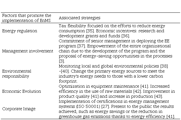 The success of an EnMS depends on the commitment of the entire organization, especially management. Without this, it makes no sense to implement the system since this would imply wasted efforts, waste of time, and unsatisfactory results [23]. The lack of motivation is a cause that makes it difficult for the EnMS to spread widely. This lack of motivation is because senior management does not see a business opportunity or support through operational policies and practices that increase competitiveness and promote the country's sustainable development through the company-state relationship, denoted by [90] as a shared value. In this way, the lack of strategic vision in senior management sometimes leaves aside the EnMS. The decision-making process usually focuses on the most profitable way to increase productivity or improve the competitive level through profitability on a specific deadline [91]. But EE improvement process is different for each industry and does not have defined deadlines. Therefore, it is essential to increase management awareness regarding this aspect [76] since, for any EMS, the management committee is fundamental because it will be in charge of establishing authorities and guarantees. So that the planning and execution processes have the resources and responsibilities that would allow the effective operation in the planning and implementation phase of the system, thus leading to integrate the EnMS into the organizational culture [24], [45], [46], [80].