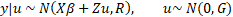 Note que se asumió que las poblaciones representadas en el efecto aleatorio u se distribuían normal con vector de media cero y matriz de varianzas y covarianzas G, siendo G compuesta por submatrices de varianzas y covarianzas de cada grupo o población.