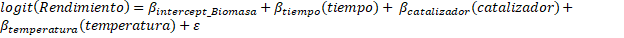 Ahora bien, en este trabajo se usó un modelo lineal generalizado para estimar el rendimiento y el contenido de carbono de las biomasas, este tipo de modelos se implementó debido a que estas dos variables toman valores entre 0 % y 100 %. Es así, que se convirtieron las respuestas a proporciones entre 0 y 1, y por lo tanto un modelo con respuesta de tipo normal puede no ser apropiado debido a que estos modelos, asumen la respuesta tomando valores en los números reales. En nuestro caso, un modelo con respuesta tipo beta fue más conveniente debido a que este asume respuestas en el intervalo abierto (0,1).