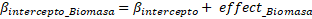 Debido a que la variable de respuesta no se distribuye como una distribución normal, se necesita un modelo lineal generalizado mixto, donde la variable de respuesta sigue una distribución beta, porque asume valores en el intervalo unitario estándar (0, 1) [47], adicionalmente un modelo mixto considera que las condiciones experimentales de cada estudio son diferentes, por lo tanto, asume que la biomasa es un efecto aleatorio.