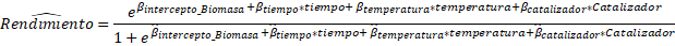 (13)Donde: “R” es Rendimiento, “t.m” es tiempo modificado, “T” es temperatura y “B” es el tipo de biomasa.
