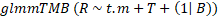 | Modelo lineal generalizado mixto tipo beta glmmTMB(R ~ t.m+T+(1┤| B)) | Intercepto | 1,295310 | 1,478964 | 0,3811 | BIC: -39,31026 |