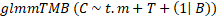 | Modelo lineal generalizado mixto tipo beta glmmTMB (C ~ t.m+T+(1┤| B) | Intercepto | -2,266993 | 0,539780 | 2,67e-05 | BIC: -92,47067 AIC: -101,8 |