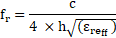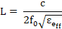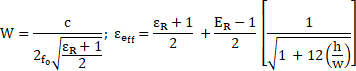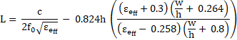 Las dimensiones de la antena se calculan partiendo de la frecuencia central de 2.45 GHz en (1) y (2) donde: (W) = ancho del parche, (L) = longitud del parche. La longitud de las ranuras en la frecuencia central de 2.4 GHz se calculan a partir de (3) y (4) [24].